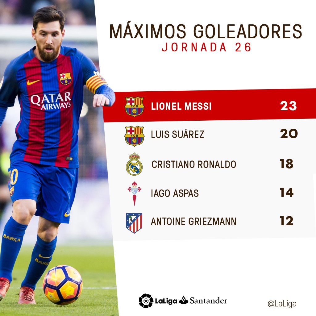 Кейинги ўринларни Луис Суарес (20), Криштиану Роналду (18), Яго Аспас (14) ва Антуан Гризманн (12) банд қилган.