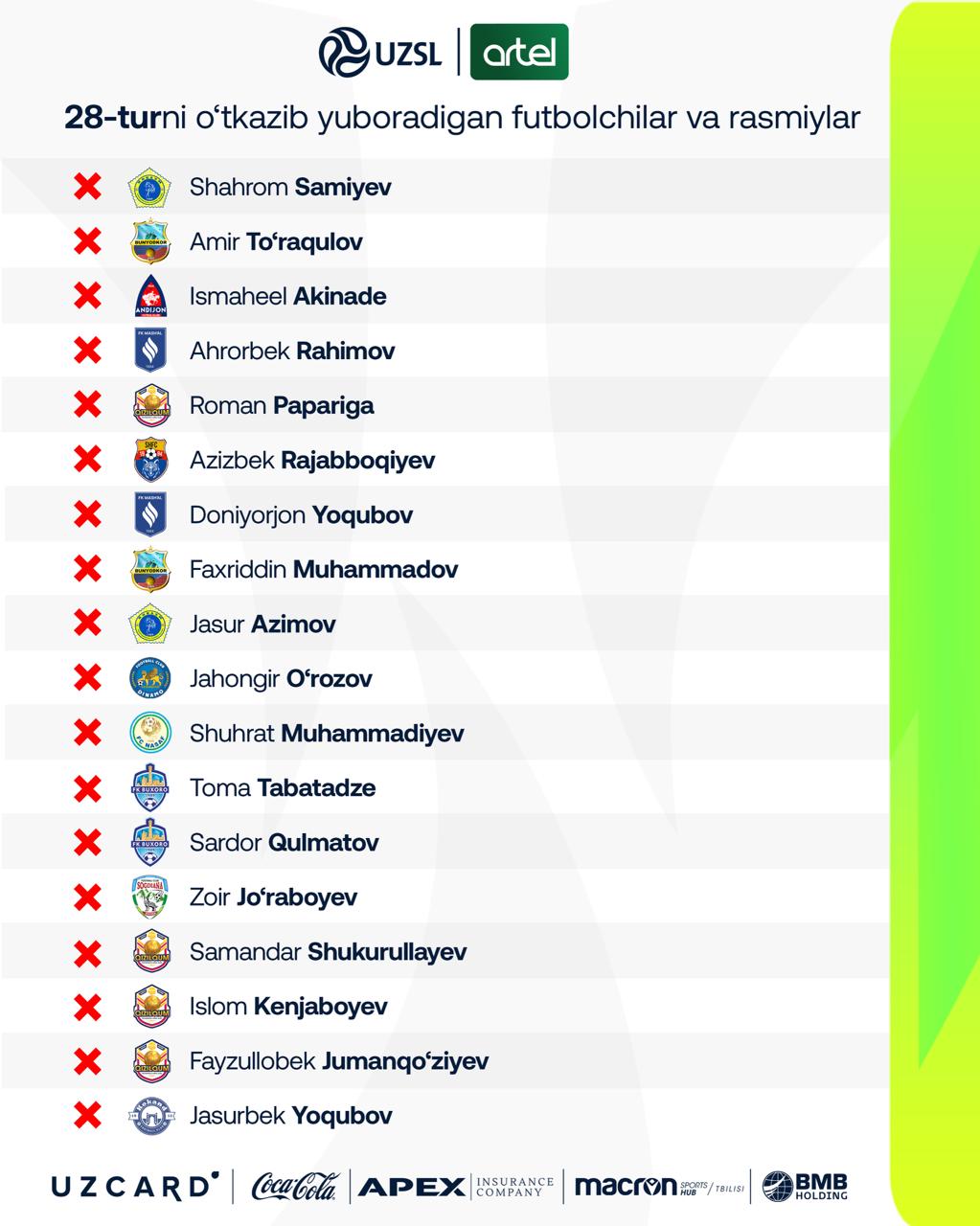 Сегодня стартовал 28-й тур Суперлиги. ПФЛ опубликовала список лиц, пропускающих тур в связи с дисквалификацией.