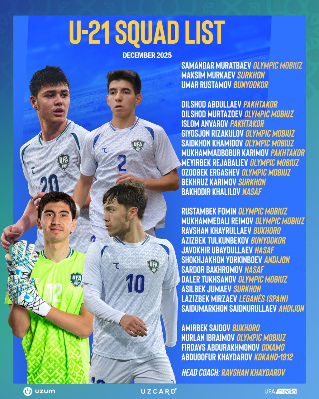 U-23 Осиё кубогига тайёргарлик кўраётган Ўзбекистон U-21 терма жамоаси 7-23 декабрь кунлари Миллий футбол марказида ўқув-машғулот йиғинларига киришади. Равшан Ҳайдаров бошқарувидаги жамоамиз Осиё кубоги олдидан 27 декабрь куни Иордания, 30 декабрь куни эса Қатарга қарши ўртоқлик ўйинида иштирок этади. Учрашувлар Доҳа шаҳрида ўтказилади.