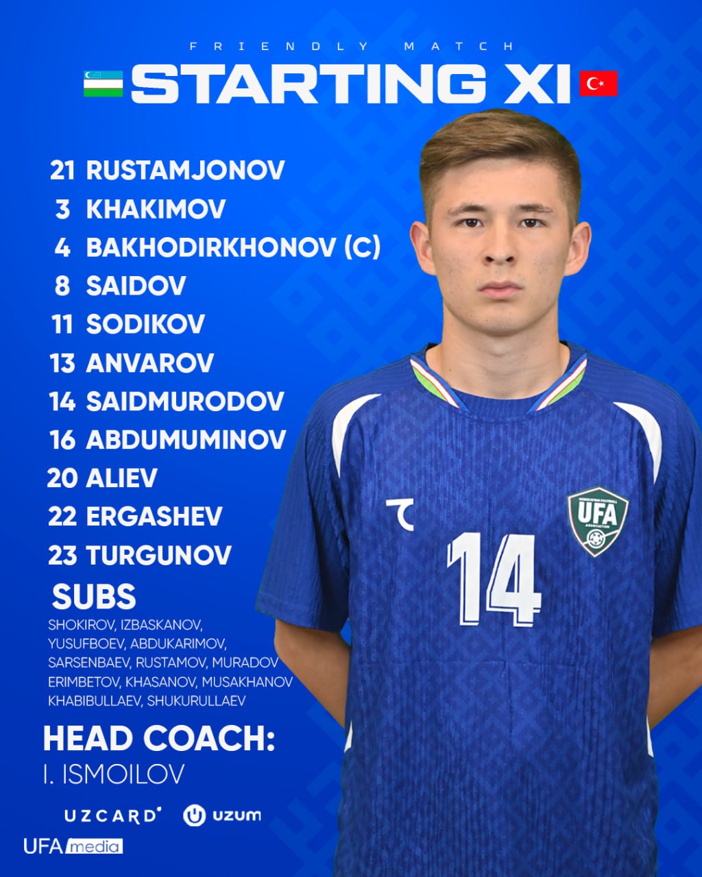 Сборная Узбекистана U17 сегдодня сыграет с Турцией товарищеский матч. Стартовый состав нашей сборной предтставлен ниже.