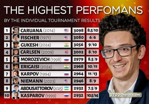 "2700chess" Нодирбек Абдусатторов натижасидан ҳайратда қолиб, замонавий шахмат тарихидаги энг яхши 10 натижа рўйхатини янгиллади