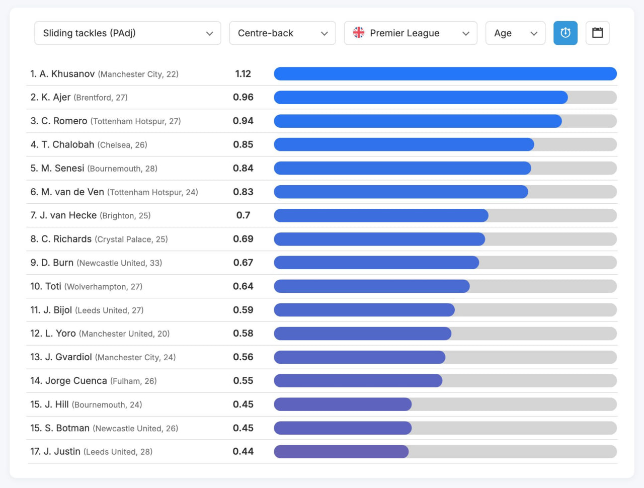 Англия Премьер-лигасида тўп сураётган марказий ҳимоячилар орасида тўпга ташланиб олиб қўйиш (подкат) бўйича энг яхши натижалар эълон қилинди. Унга кўра, Абдуқодир Ҳусанов ушбу рейтингда биринчи ўринни эгаллаб турибди.