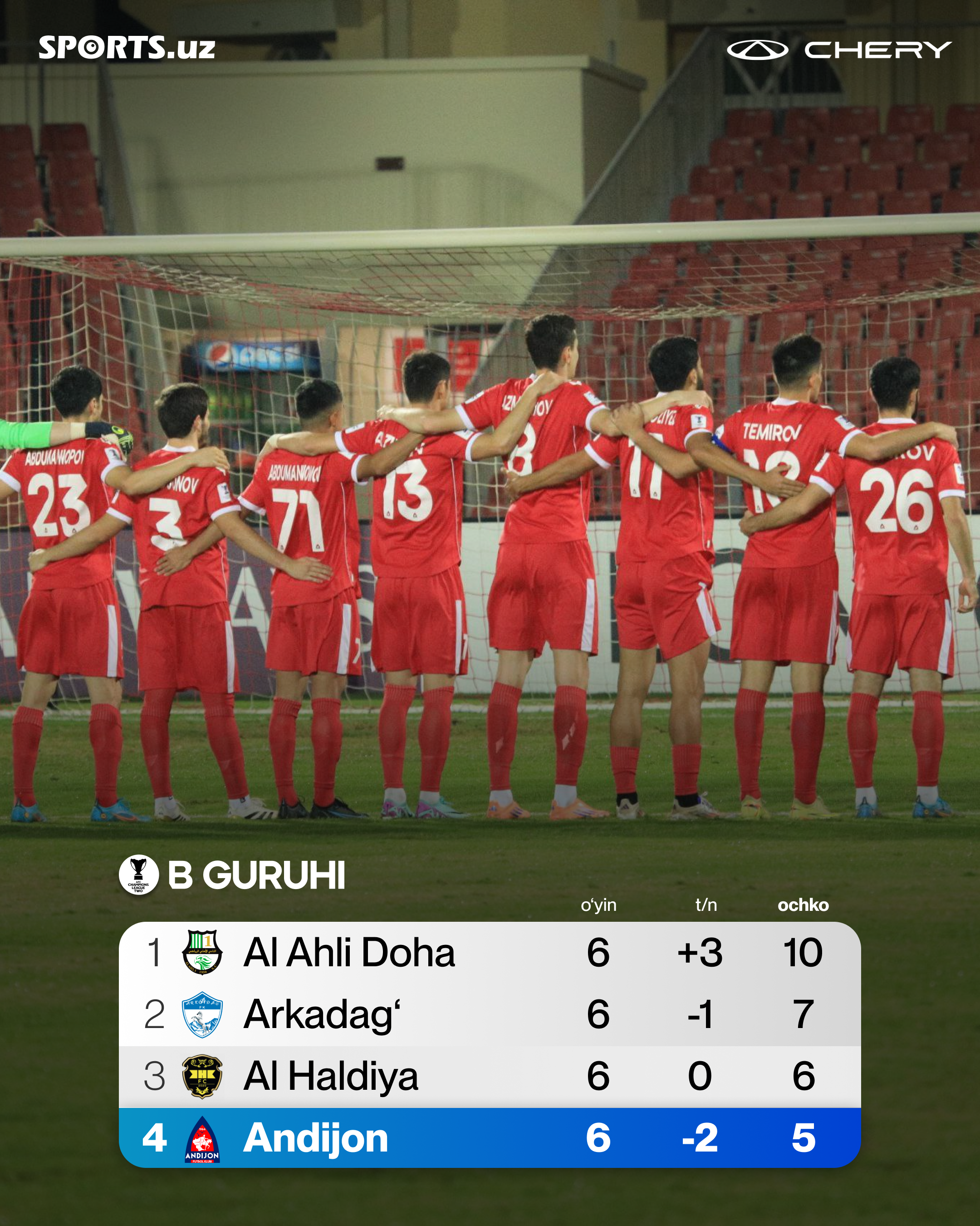Вчера завершились матчи шестого тура Лиги Чемпионов Азии 2. Проиграв «Аль-Ахли» со счетом 0:2, «Андижан» завершил свое участие на турнире. Клуб Туркменистана «Аркадаг» со счетом 1:0 победил «Аль-Халдия» и вышел в следующий этап.