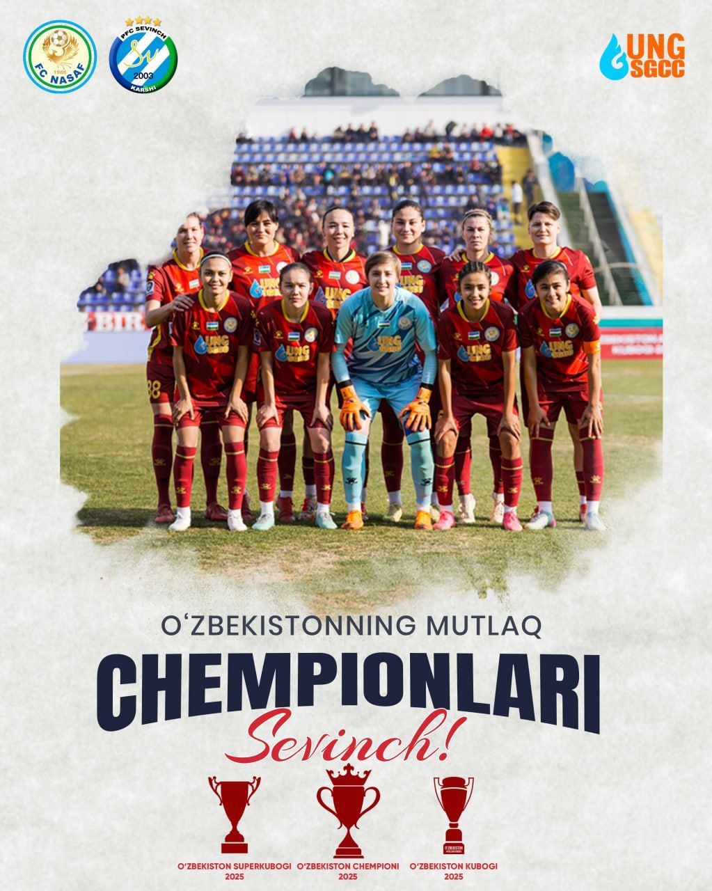 Бугун Қарши марказий ўйингоҳида Аёллар профессионал футбол жамоалари ўртасидаги Ўзбекистон кубоги–2025 финал баҳси бўлиб ўтди. Ушбу учрашувда севимли "Севинч" жамоаси "Қизилқум-W" жамоаси устидан 4:2 ҳисобида ғалаба қозонди.