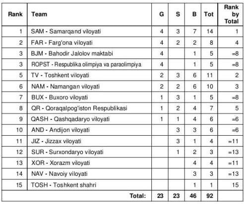 Умумжамоа ҳисобида Самарқанд вилояти қизлари 4 та олтин, 3 кумуш ва 7 та бронза медаллари билан биринчи бўлди. Иккинчи ва учинчи ўринни Фарғона спортчилари ва Баҳодир Жалолов номидаги боксга ихтисослаштирилган спорт мактаби ўқувчилари 4 тадан олтин билан эгаллади.