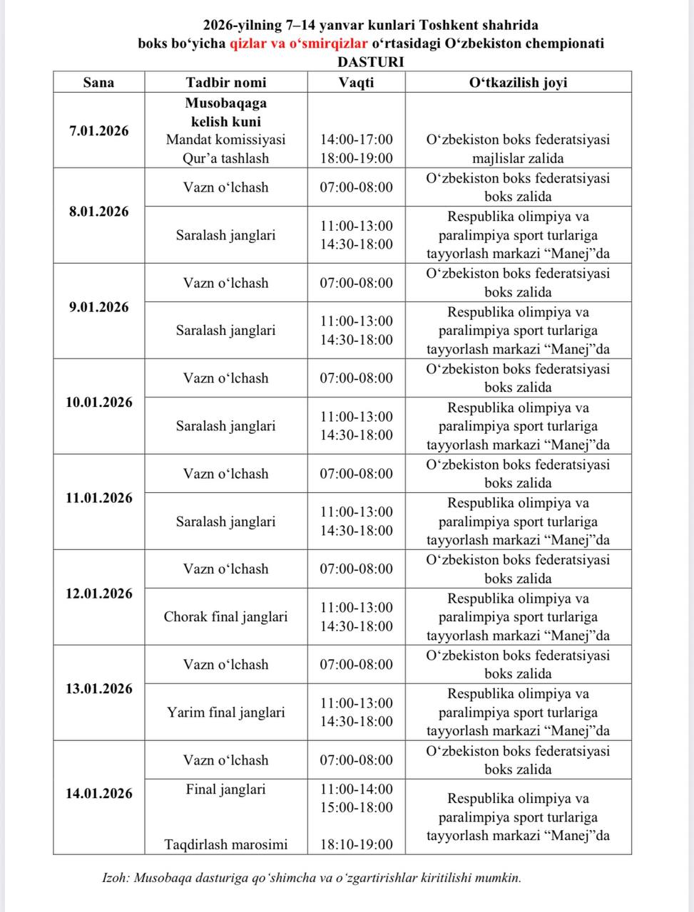 7-14 январь кунлари Тошкент шаҳрида жойлашган Республика олимпия ва паралимпия спорт турларига тайёрлаш маркази “Manej” да ўсмирлар (U-17 қиз болалар) ва ёшлар (қиз болалар) ўртасида Ўзбекистон чемпионати бўлиб ўтади.