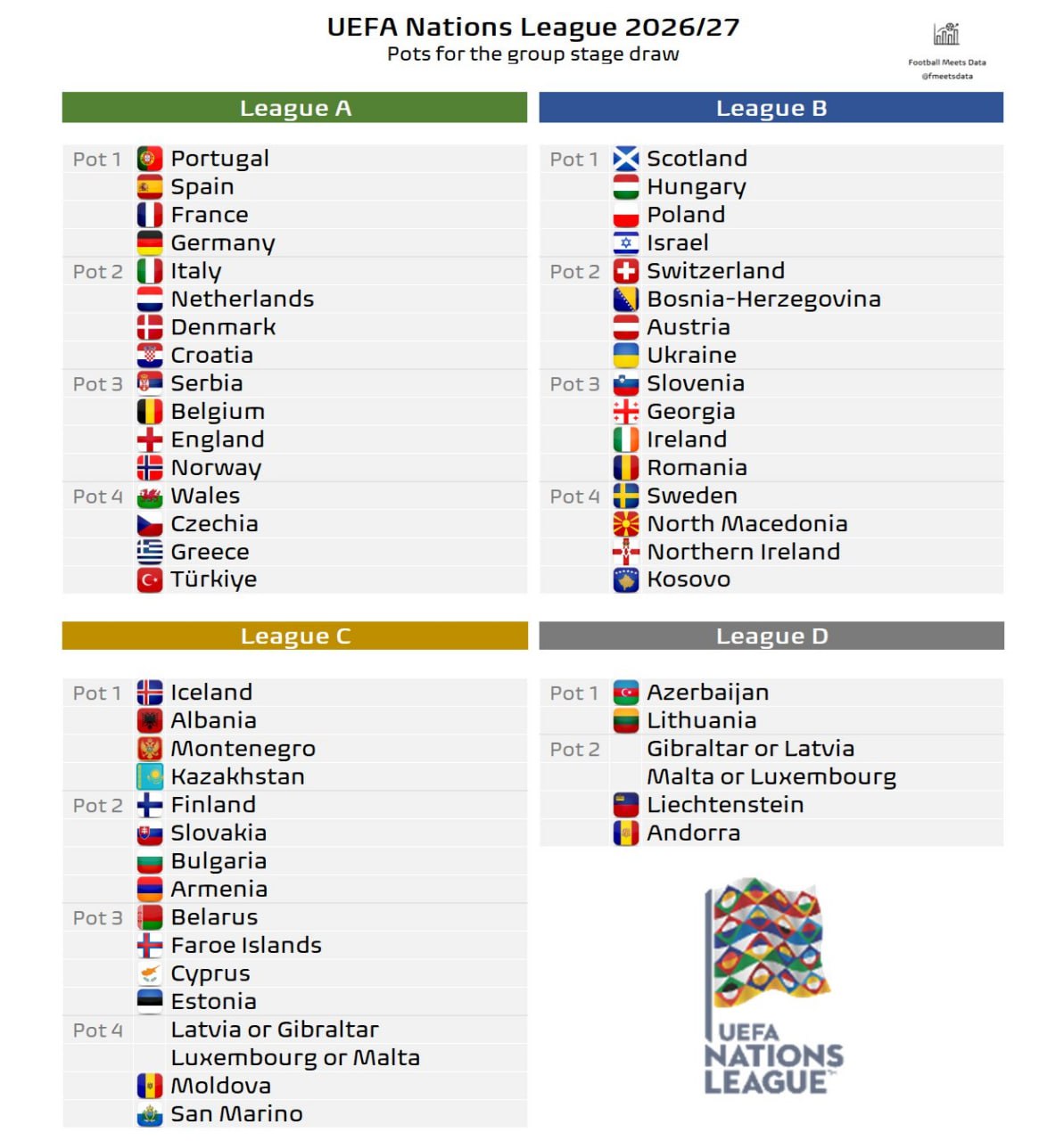 Мусобақада қатнашадиган УЕФАга аъзо 54 та терма жамоа тўртта лигага тақсимланган (бунда 2026 йил март ойидаги C ва D лигалари ўртасидаги плей-офф ўйинлари инобатга олинади).