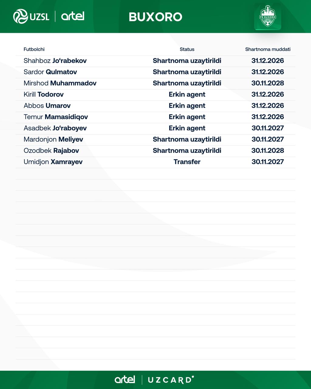 Янги мавсумга жиддий тайёргарлик кўраётган бухороликлар 10 та футболчини Лига рўйхатдан ўтказганини маълум қилди. 4 нафар футболчи эркин агент сифатида жамоага келиб қўшилган бўлса, 5 нафар ўйинчи билан шартнома узайтирилди. 1 нафар футболчи эса янги трансер қилинди.