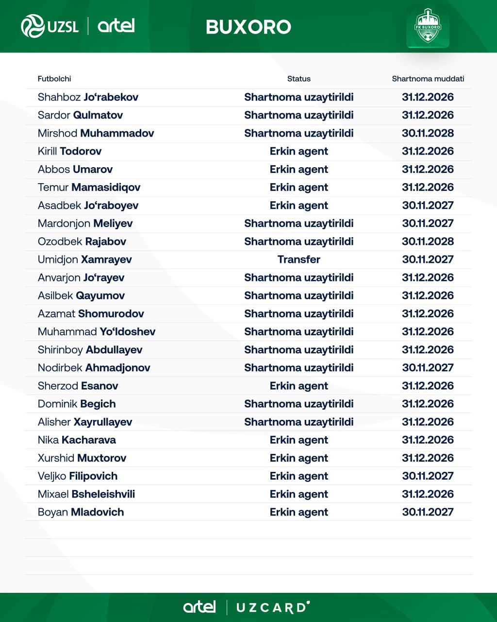 "Бухоро" Суперлиганинг янги мавсуми олдидан ўз таркибини бир қатор футболчилар билан кучайтирди. Клуб бугун 24 нафар ўйинчини лига рўйхатидан ўтказганини маълум қилди. Қуйида ушбу рўйхат билан танишиб чиқишингиз мумкин.