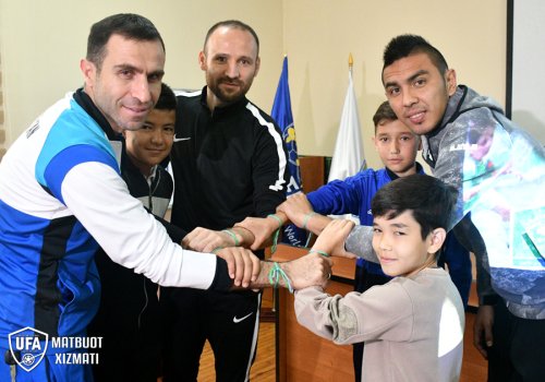 Кейин "Футбол дўстлик учун" лойиҳасида Ўзбекистон шарафини ҳимоя қиладиган Асилбек Нўъмонов, Абдулла Турсунбоев ва Асадбек Рўзимовлар лойиҳанинг мақсади ҳақида ўз тенгдошларига тушунча бериб ўтишди ва тиниқ осмон ҳамда яшил майдонни акс эттирувчи ҳаворанг ва яшил рангли билакузукларни бир-бирларига тақиб қўйишди.