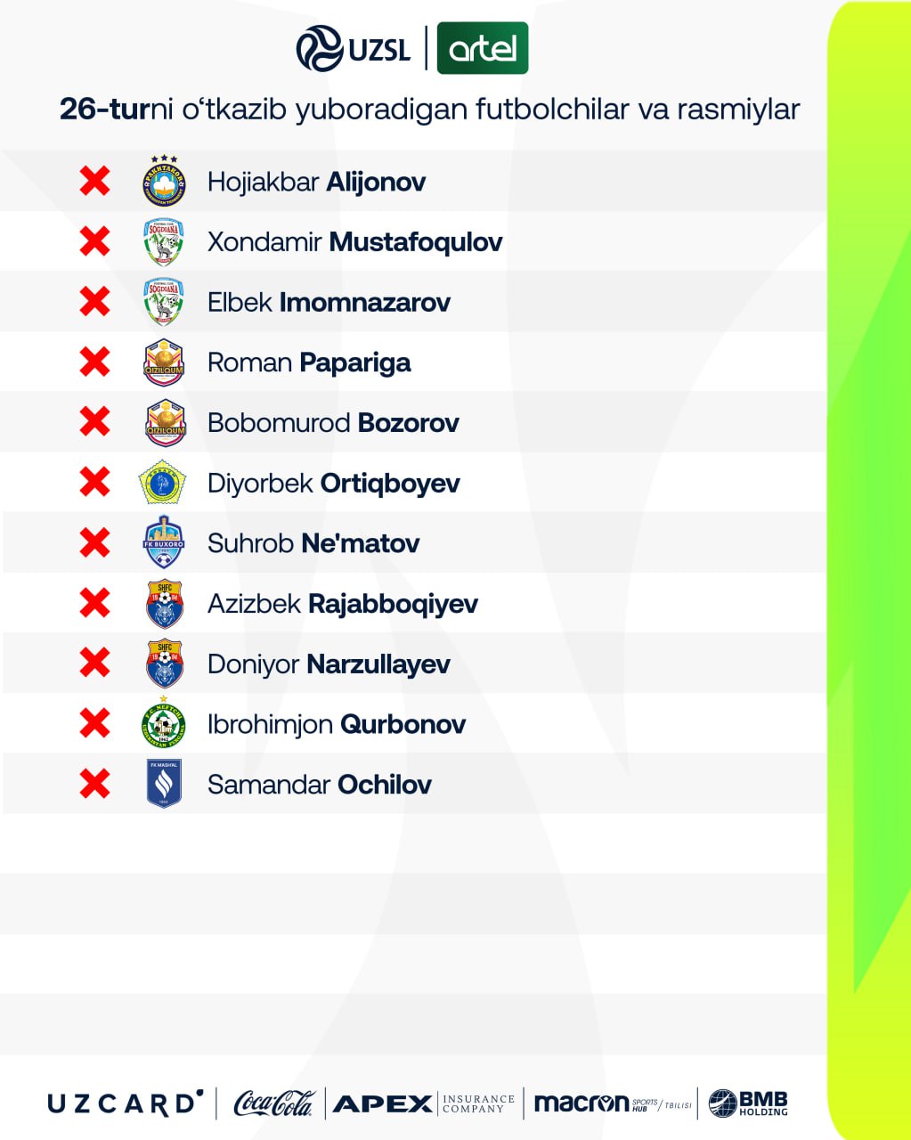 Сегодня стартует 26-й тур Суперлиги. Предстоящий тур в связи с дисквалификацией пропустят следующие лица.