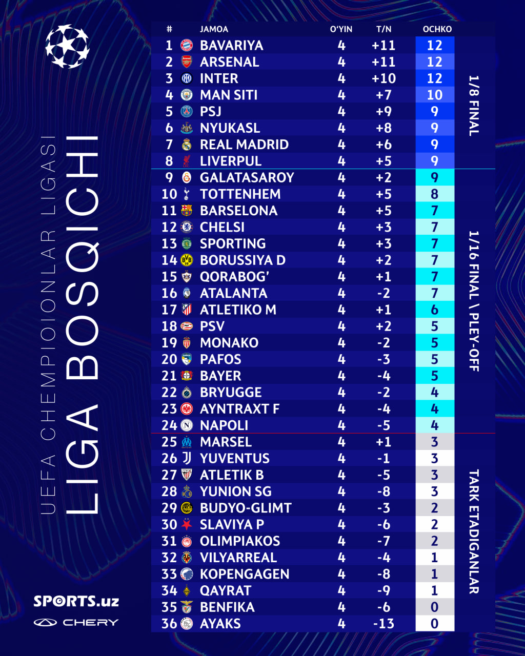 Hozirgi paytda turnir jadvalida uchta klub peshqadamlik qilmoqda. "Bavariya", "Arsenal" va "Inter" jamoalari 4-turdan so‘ng 12 ochkodan to‘plagan holda peshqadam sanaladi. Keyingi, 4-o‘rinni esa 10 ochko bilan "Manchester Siti" egallab turibdi.