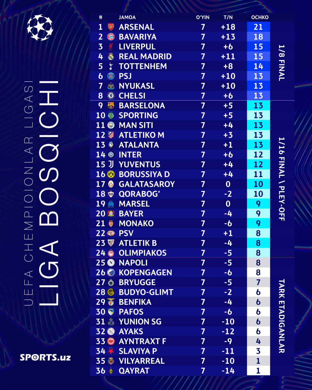 ЕЧЛ. 7-турдан сўнг турнир жадвалидаги ҳолат қандай?