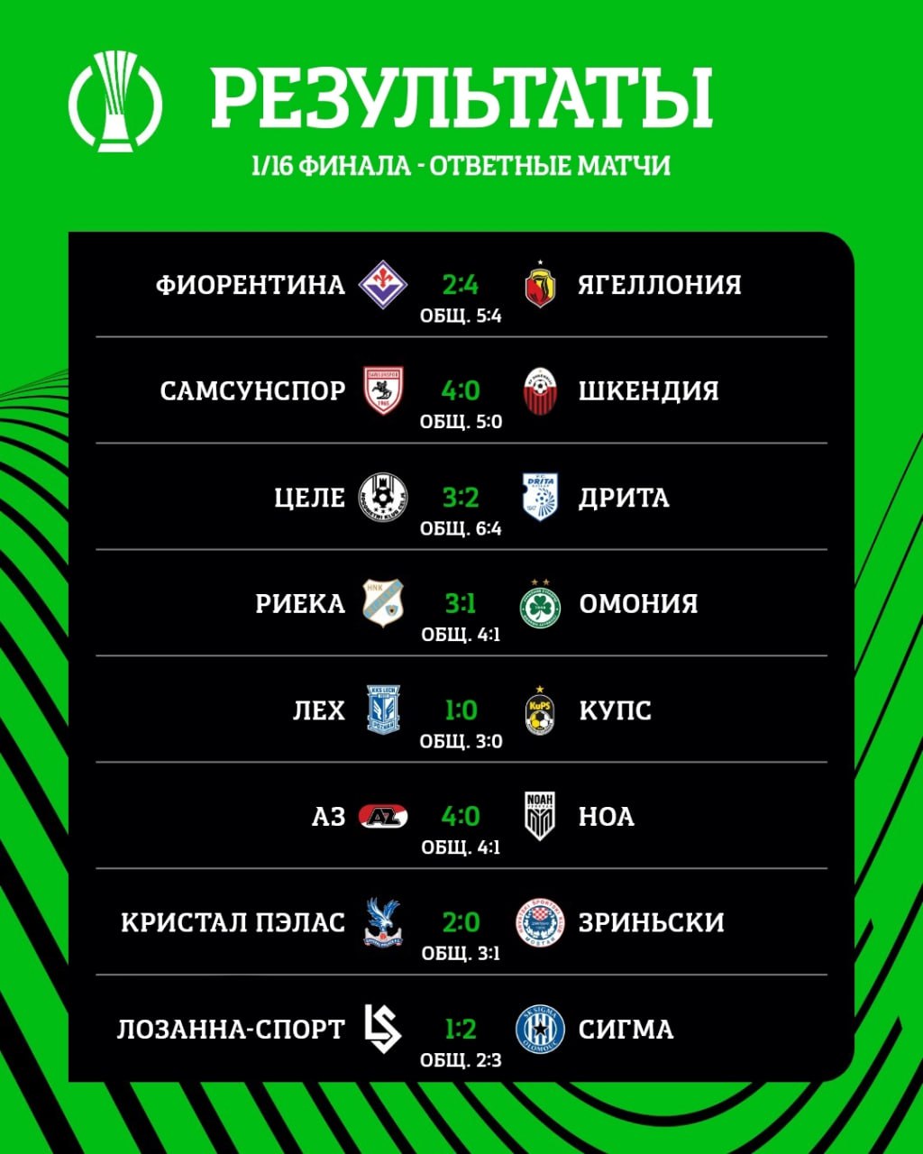 Унга кўра, 1/8 финалга "Фиорентина", "Самсунспор", "Целе", "Риека", "Лех", "АЗ Алкмар", "Кристал Пэлас", "Сигма" клублари йўл олди.