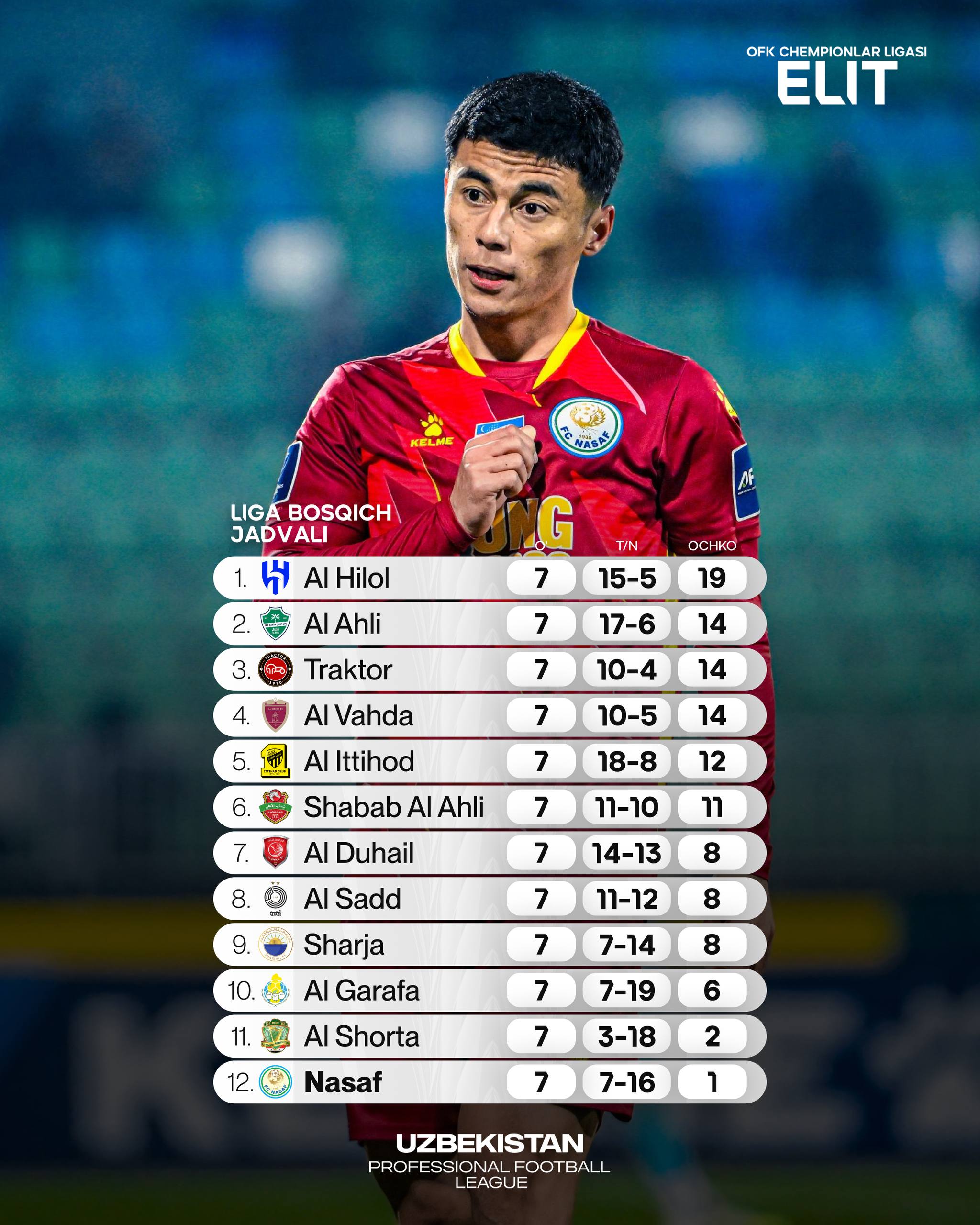 9-10 февраль кунлари Элит Осиё Чемпионлар лигасининг 7-тур баҳслари бўлиб ўтди. Ушбу турда кутилмаган натижалар ва катта жамоаларнинг очко йўқотишларига гувоҳ бўлдик. Тур якунларига кўра, Элит ОЧЛда мусобақа жадвали қуйидагича кўриниш олди.