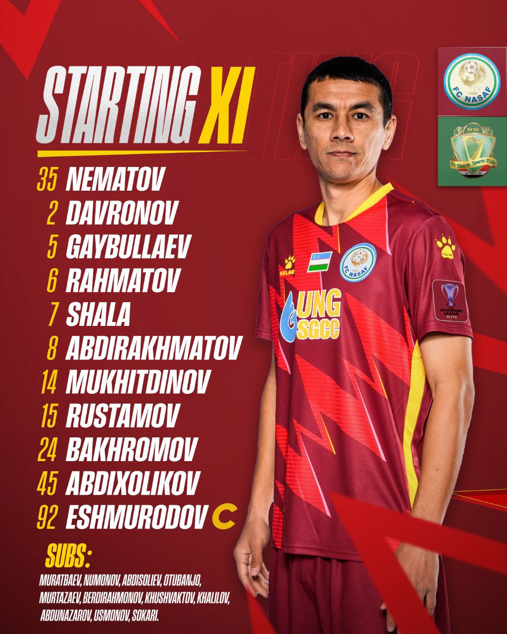 Бугун Элит Осиё Чемпионлар лигасининг 7-тур баҳсларига старт берилди. Ушбу турда Ўзбекистон шарафини ҳимоя қилаётган Қаршининг “Насаф” клуби Фарғонадаги “Истиқлол” стадионида Ироқнинг “Ал-Шорта” клубига қарши баҳс олиб боради. “Аждарлар учрашувни қуйидаги таркибда бошлайди.