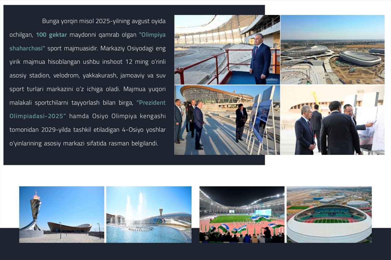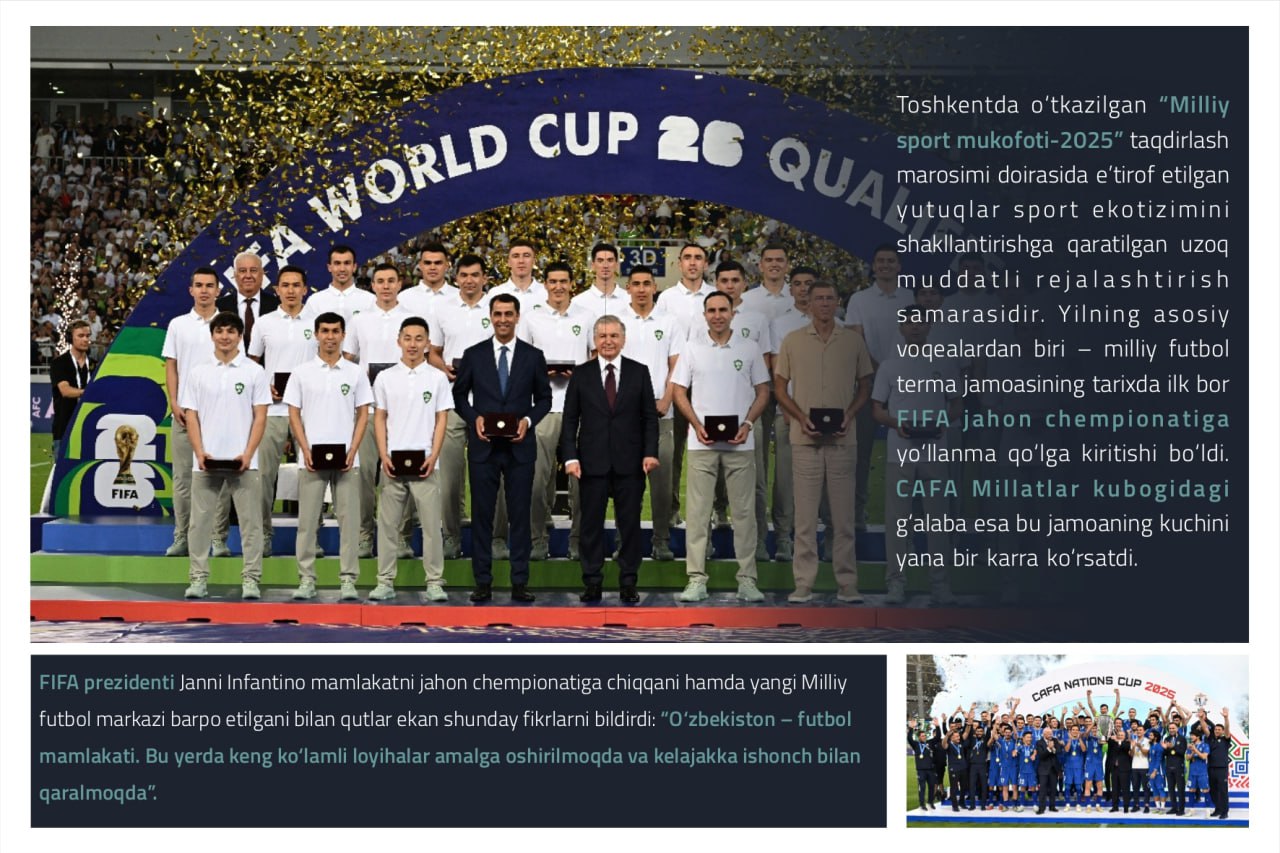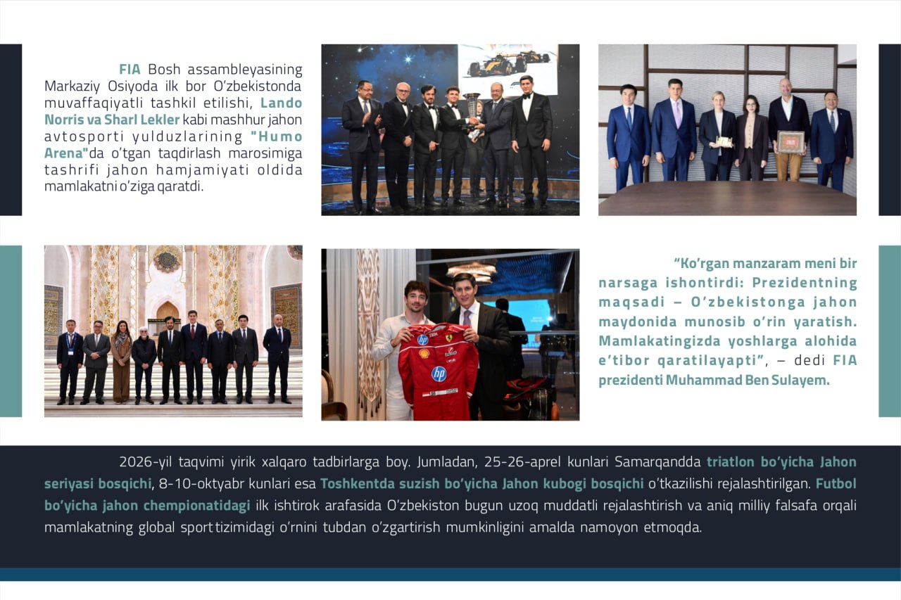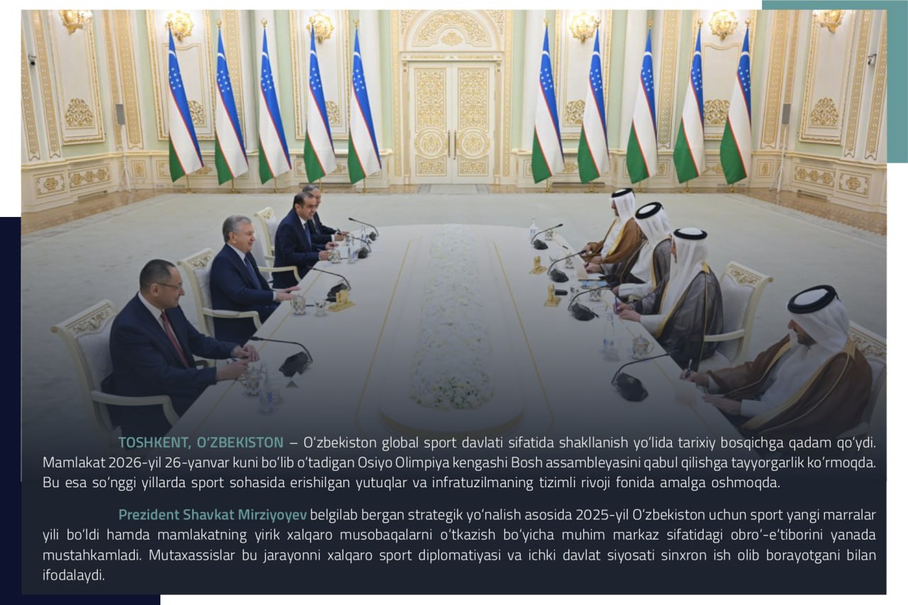 Ўзбек спортида сўнгги йилларда эришилаётган ютуқлар, соҳада амалга оширилаётган ислоҳотлар нафақат жаҳон ҳамжамияти, балки оммавий ахборот воситаларининг ҳам эътиборини тортмоқда. Insidethegames.biz, sports-insight.co.uk ва Европанинг бошқа кўплаб таниқли нашрлари юртимиз спорти учун ғоят сермаҳсул ўтган 2025 йил якунлари, шунингдек, Президентимизнинг соҳани қўллаб-қувватлаб келаётгани ҳақида таҳлилий мақолалар чоп этмоқда. Уларнинг таржимаси ушбу слайдларда.