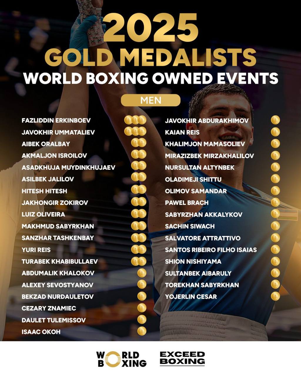 Унга кўра, эркаклар орасида, Фазлиддин Эркинбоев ва Жавоҳир Умматалиевлар учта олтин билан турнир етакчиси бўлиб, йилни якунламоқда.