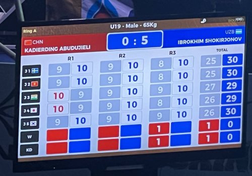 Бобомурод Боймирзаевда ҳам ғалаба. Боксчимиз -60 кг вазнда, Хитой Тайпейи вакили Сун Жао Тингни учинчи раундда техник нокаутга учратди.