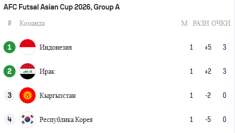 Илк учрашувлардан сўнг, Индонезия биринчи, Ироқ эса иккинчи ўринни эгаллаб турибди.
