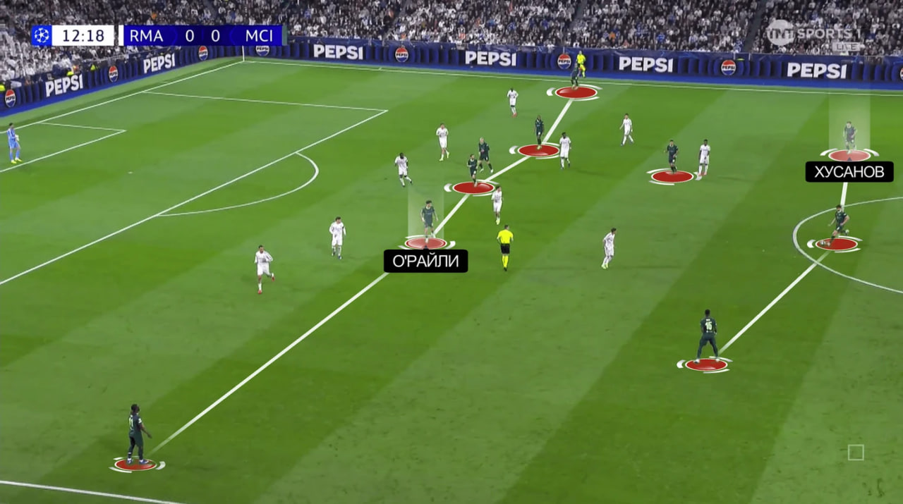 Биринчи голда эса ЎРайли Феде Вальверде билан дуэлда ютқазди. "Реал" "Сити"нинг прессингини қисқа паслар орқали ёра олмаганида, узун узатмалардан фойдаланди. Айнан шу усул билан ҳисоб очилди. Бу вазиятларда ЎРайлининг асосий камчилиги — рақибга эмас, фақат тўпга қараб ҳаракат қилгани бўлди. Бу замонавий ҳимоячиларда учрайдиган классик хатолардан бири ҳисобланади.