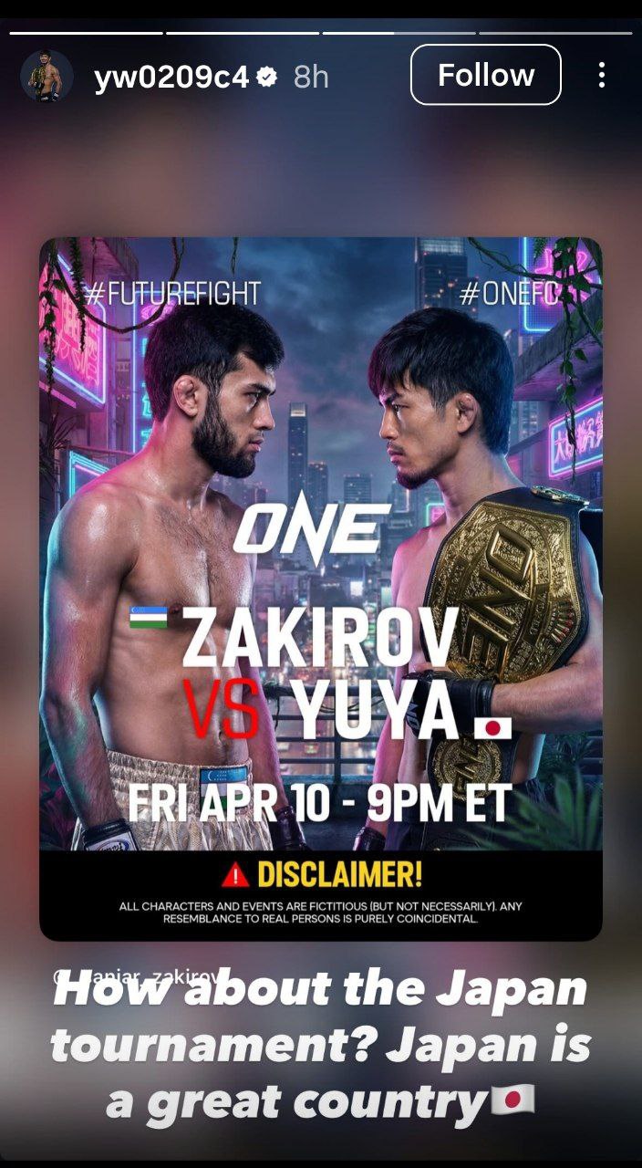Кеча таниқли спортчимиз Санжар Зокиров (16-0) Instagram саҳифасида амалдаги ONE FC чемпиони Юя Вакамацу(20-6)га атаб пост қўйиб, 10 апрель куни ўзаро жанг ўтказишга чақирганди.