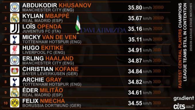 Бир неча ҳафта аввал Европа Чемпионлар лигасининг гуруҳ босқичининг энг тезкор футболчилари рейтинги тузилган эди. Унда Ўзбекистон миллий терма жамоаси ва "Манчестер Сити" клуби ҳимоячиси Абдуқодир Ҳусанов 34,7 км/соат тезлик билан иккинчи поғонани банд этган эди. Абдуқодир ўша рўйхатда фақатгина "Реал Мадрид" форварди Килиан Мбаппедан ортда қолган эди. "Gradient Sports" портали ҳам ЕЧЛнинг тезкор футболчилари рейтингини тузиб чиқди. Бу сафарги рейтингда Ҳусанов етакчига айланди. У 35,8 км/соат тезлик қайд этди. Иккинчи поғонани Мбаппе эгаллади. Унинг тезлиги 35,67 км/соатни ташкил этади.
