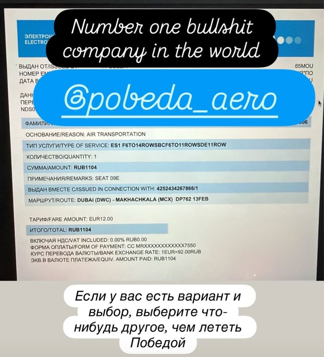 "Победа – дунёдаги биринчи рақамли фирибгар авиакомпания. Агар танлов қилиш имконингиз бўлса, ундан бошқасини танланг", – деб ёзди россиялик ижтимоий тармоқдаги саҳифасида.