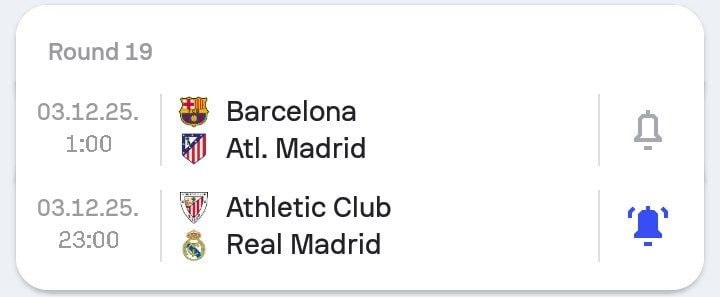 Хабарингиз бор 2026 йилнинг январь ойида Испания Суперкубоги баҳслари бўлиб ўтади. Шу сабабдан, "Барселона" "Атлетико Мадрид" ҳамда "Атлетик Билбао" "Реал Мадрид" учрашувлари 3-декабрь санасида ўтказилади.