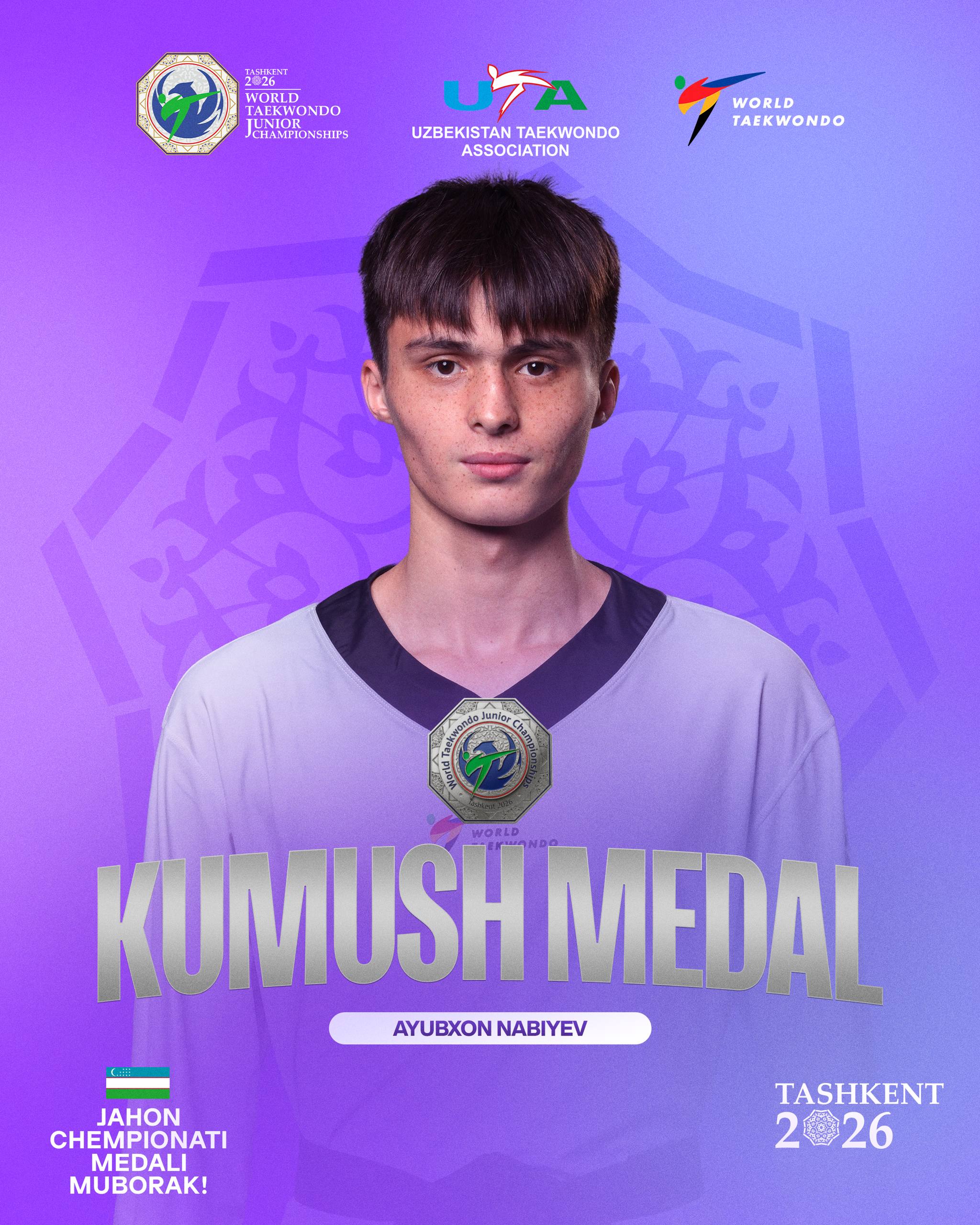 Пойтахтимиз мезбонлигида ўтаётган таэквондо WТ бўйича XV ёшлар ўртасидаги Жаҳон чемпионатида Ўзбекистон терма жамоаси тўртинчи медалига эга чиқди. Йигитлар ўртасида -68 кг вазн тоифасида терма жамоамиз шарафини ҳимоя қилувчи Аюбхон Набиев мусобақа финалига қадар етиб келди.
