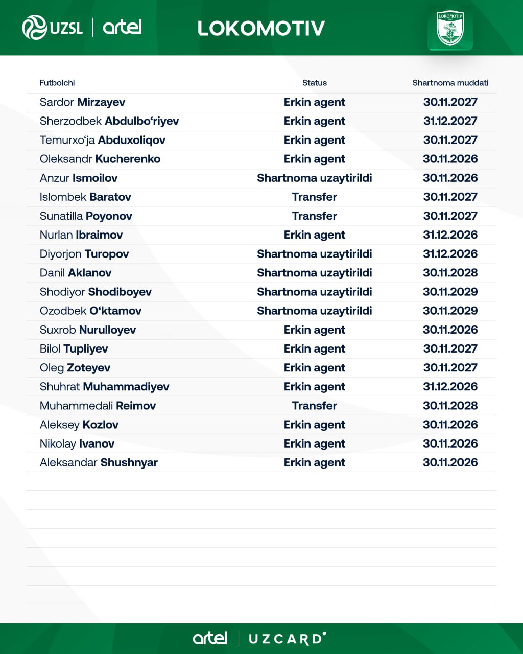 "Локомотив" Суперлиганинг янги мавсуми олдидан ўз таркибини бир қатор футболчилар билан кучайтирди. Клуб лига учун 20 нафар ўйинчини рўйхатдан ўтказганини маълум бўлди,