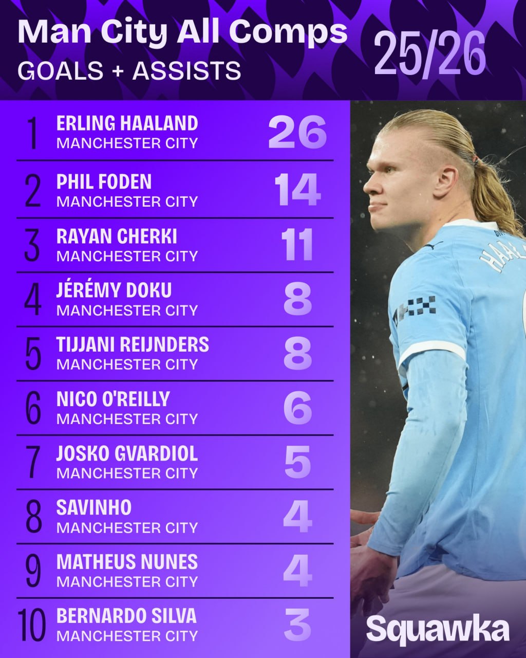 2025/26 йилги мавсумда "Манчестер Сити" футболчилари Европа Чемпионлар лигаси, Англия Премьер-лигаси, Англия кубоги ва Лига кубогида иштирок этишмоқда. Ушбу 4 мусобақада "шаҳарликлар"нинг энг сермаҳсул натижа қайд этаётган футболчиси Эрлинг Холанд ҳисобланади. Норвегиялик форвард жорий мавсумда гол+ассист тизимида 26 балл тўплаган. Иккинчи ўриндан оптимал спорт формасига қайтаётган Фил Фоден жой олган. Англия терма жамоаси вакили жорий мавсумда 14 та голда бевосита иштирок этган. Кучли учликдан жамоа ярим ҳимоячиси Райан Шерки жой олган. Унинг ҳисобида 11 та гол+ассист мавжуд. Кучли ўнликдан қуйидаги футболчилар жой олган.