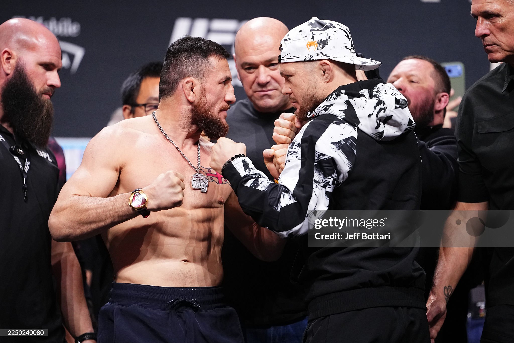 Дастлаб, оқшмонинг марказий тўқнашуви: Мераб Двалишвили - Пётр Ян қарама-қаршилигига эътибор қаратамиз. Улар аввал ҳам октагонда жанг қилишганидан хабарингиз бор. Ўша баҳсда гурзиялик ҳакамларнинг якдил қарори билан ғалабага қозонган эди. Двалишвили UFC тарихида энг кўп тейкдаун амалга оширишган жангчи ҳисобланади - 117 та. Улардан 49 таси Янга қарши илк жангда содир бўлган. Россиялик уларнинг 19 тасидан муваффаққиятли ҳимоялана олганди. Бу статистикадан кўп нарсани билиш олиш мумкин. Мераб UFC даги энг ҳужумкор жангчи ҳисобланади, у олдинга ўтгани йиртқич ҳайвон мисоли ўлжасига ташланади, қаршисидагини ҳолдан тойдириб юборади. Энергияси ҳам жуда баланд. У хоҳ октагондан ташқарида бўлсин, хоҳ ичида, ҳатто раундлар орасида бошқа жангчилар сув ичиб, нафас ростлаб олишса, Мерабни сакраётган алпозда кўрасиз. Гўё бироз аввал жанг қилмагандек. UFC да унинг лақаби - "кардио машина". UFC га кўтарилиши икки мағлубият билан бошланган эрса-да, 14 баҳсдан буён ғалабали серия қайд этмоқда. Ўтган йили чемпионига айланган грузин бу йил 3 бор камарини мувафаққиятли ҳимоя қилди ва тўртинчи ҳимоя жангида ҳам фаворит бўлиб турибди.