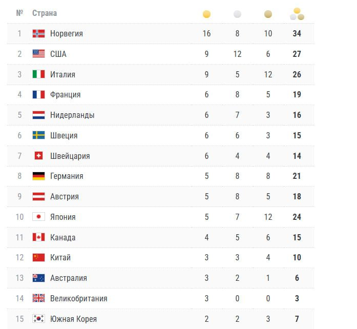 Кун якунларига кўра, Норвегия терма жамоаси 16 та олтин, саккизта кумуш ва 10 та бронза, жами 35 та медаль билан Олимпиаданинг медаллар жамғариш рейтингида ишончли етакчиликни давом эттирмоқда. АҚШ терма жамоаси олтин ва кумушнинг кўплиги туфайли умумий ҳисобда Италияни ортда қолдирди, америкаликларда жами 27 та медаль бор: тўққизта олтин, 12 та кумуш ва олтита бронза. Италия ҳисобида 26 та медаль бор: тўққизта олтин, бешта кумуш ва 12 та бронза.