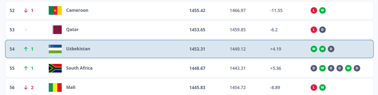 ФИФА рейтингида ўсиш: 2021 йилда 85-ўринда бўлган Ўзбекистон 2025-йилда 54-ўринга кўтарилди.