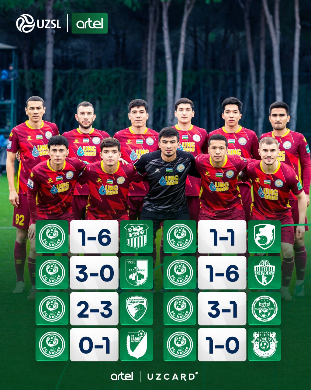 Қаршининг "Насаф" клуби Туркиянинг Анталия шаҳрида ташкил этилган ўқув-йиғинни якунлади. 15 кун давом этган йиғин мобайнида "аждарлар" жами 8 та ўртоқлик учрашувида майдонга тушиб, қуйидагича натижалар қайд этди.