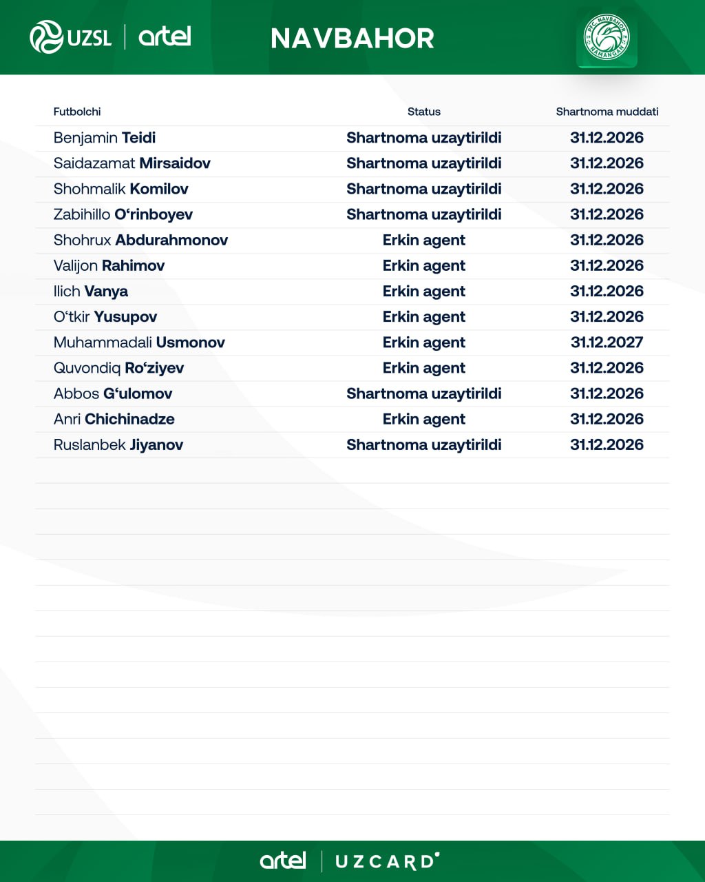Перед стартом нового сезона «Навбахор» усилил состав рядом футболистов. Согласно информации, клуб зарегистрировал в Лиге 13 игроков.