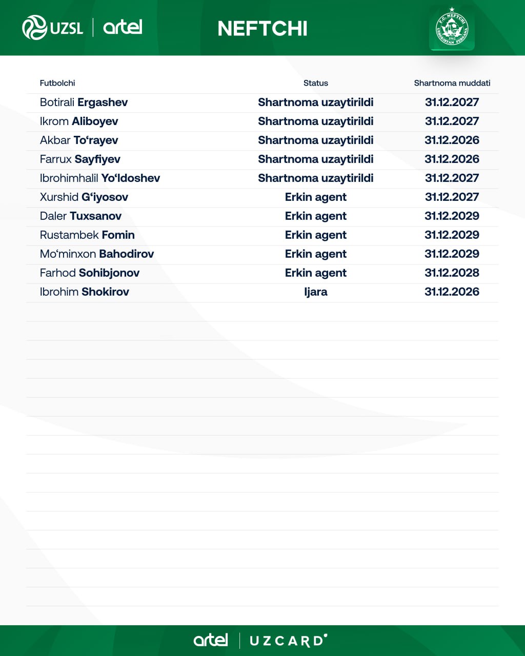 Янги мавсумда ҳам чемпионликни мақсад қилган Фарғонанинг “Нефтчи” клуби 11 нафар футболчини лигада рўйхатдан ўтказди. 5та футболчи билан шартнома узайтирилди. 5 нафар футболчи эркин агент сифатида “йўлбарслар” сафига келиб қўшилган бўлса, 1 нафар футболчи ижарага олинган.