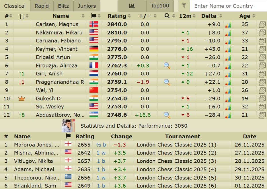 Энди эса у London Chess Classic 2025 турнирида навбатдаги ғалабалар билан деярли шу йўқотилган очколарнинг барчасини қайтариб олмоқда: кетма-кет турлардаги ижобий натижалар жонли рейтингни яна 2750+ диапазонига яқинлаштирди ва у рейтингда 12-ўринда бормоқда.