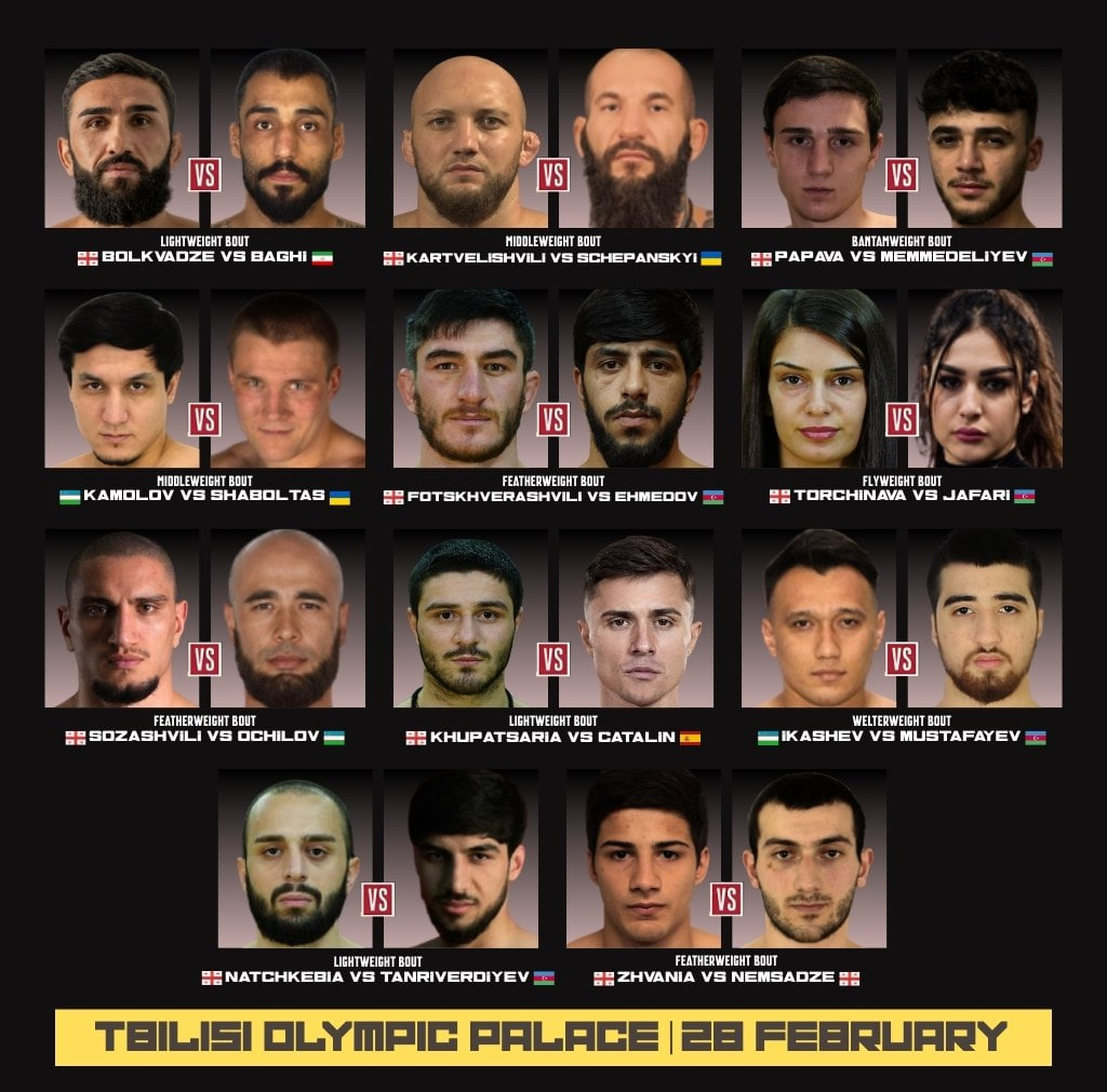 Эътиборлиси, унда ўзбекистонлик ММА устаси Одилхон Камолов (8-5) ҳам иштирок этиб, украиналик Станислав Шаболтас(4-15)га қарши жанг қилади. Шунингдек, мазкур оқшомда яна бир ҳамюртимиз Улуғбек Икашев (11:0) ва Озарбайжон вакили Амил Мустафаев (3-11) билан тўқнаш келса, спортчимиз Сардор Очилов (3-3) мезбонлар вакили Саба Сазашвили (5-5)га қарши кураш олиб бориши режалаштирилган.