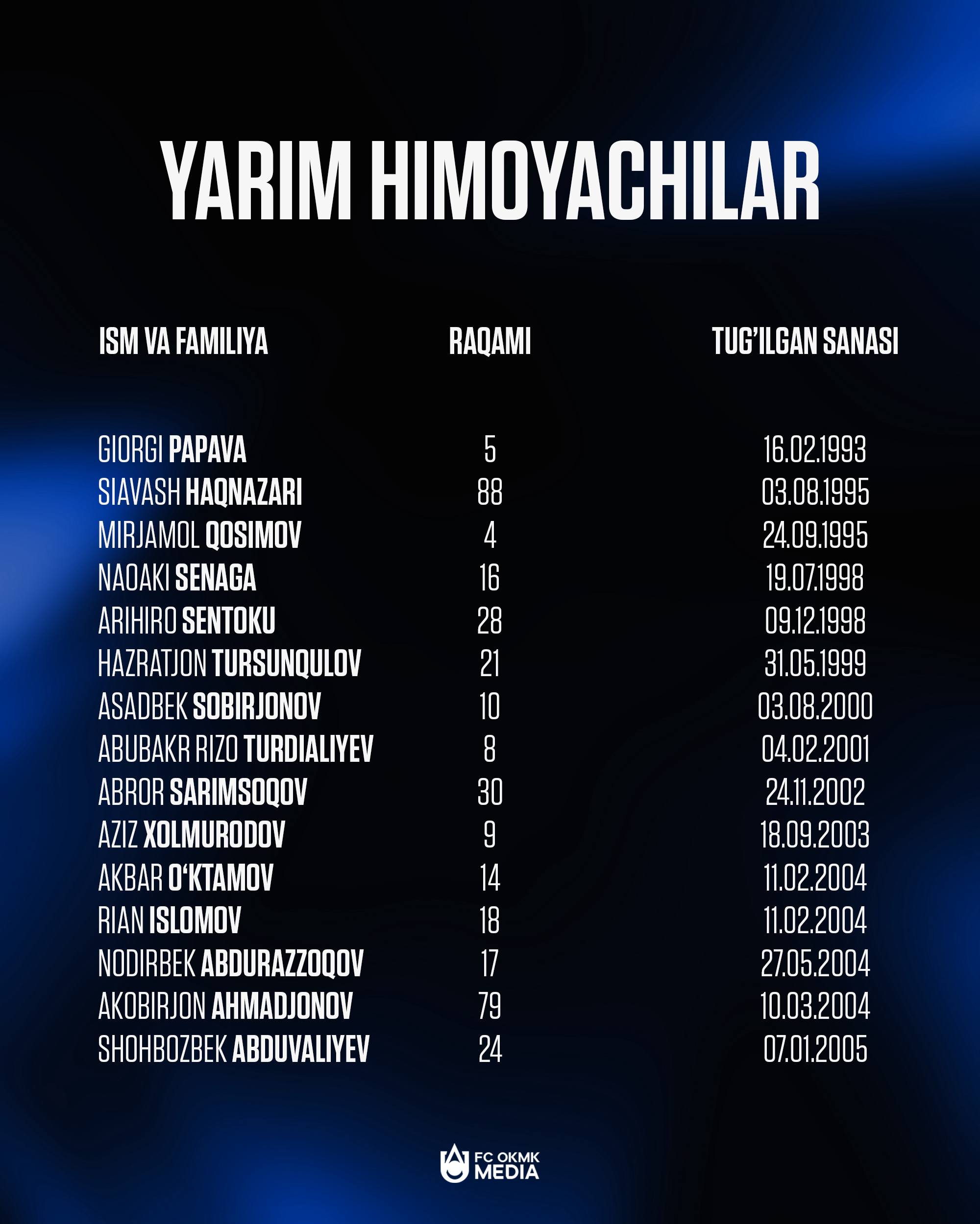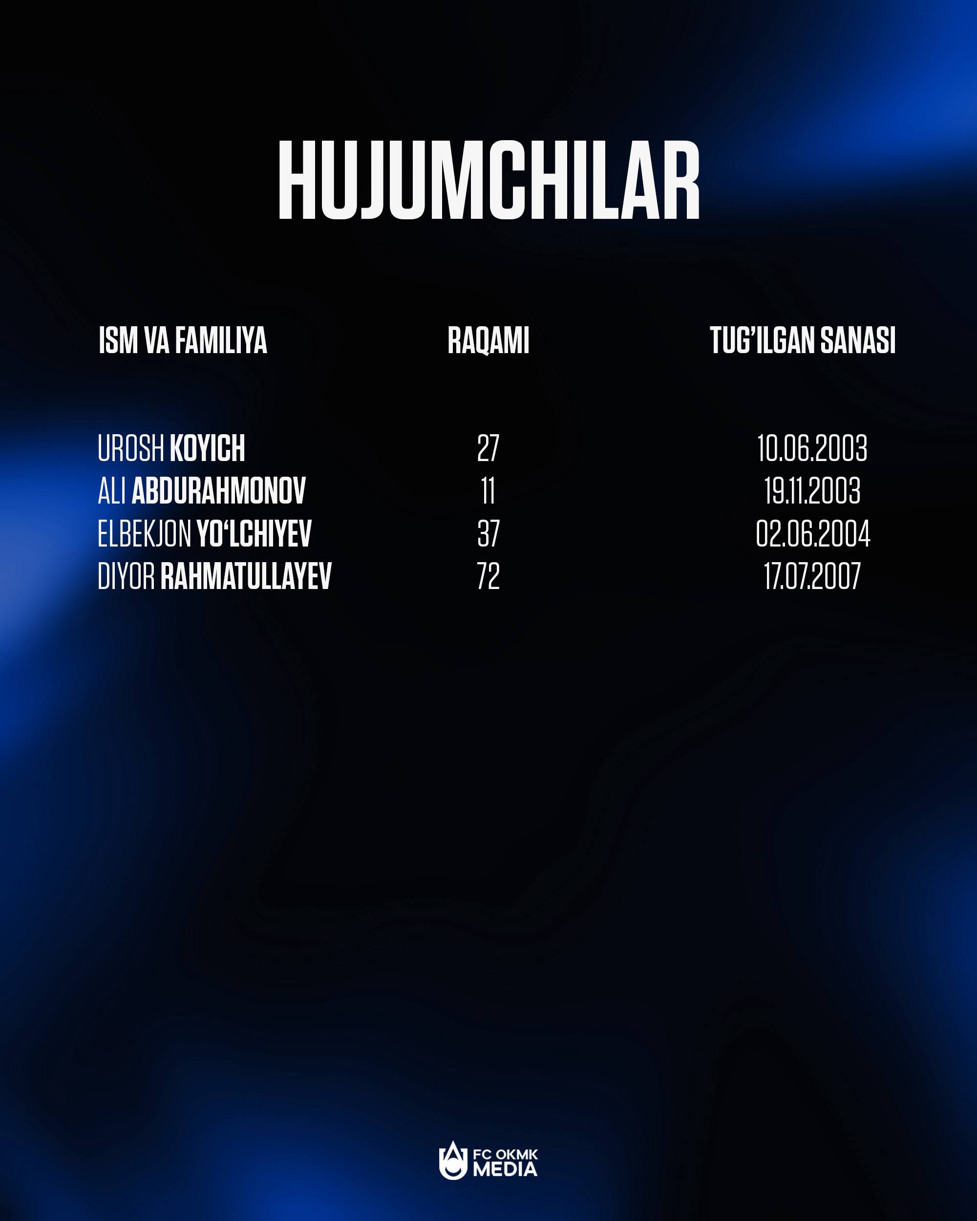 Олмалиқнинг ОКМК клуби 2026 йилги мавсум учун барча футболчиларни ЎзПФЛ рўйхатидан ўтказди. Жамоа 5 нафар дарвозабон, 15та ҳимоячи, 15та ярим ҳимоячи ва 4 нафар ҳужумчи хизматларидан янги мавсумда фойдаланади.
