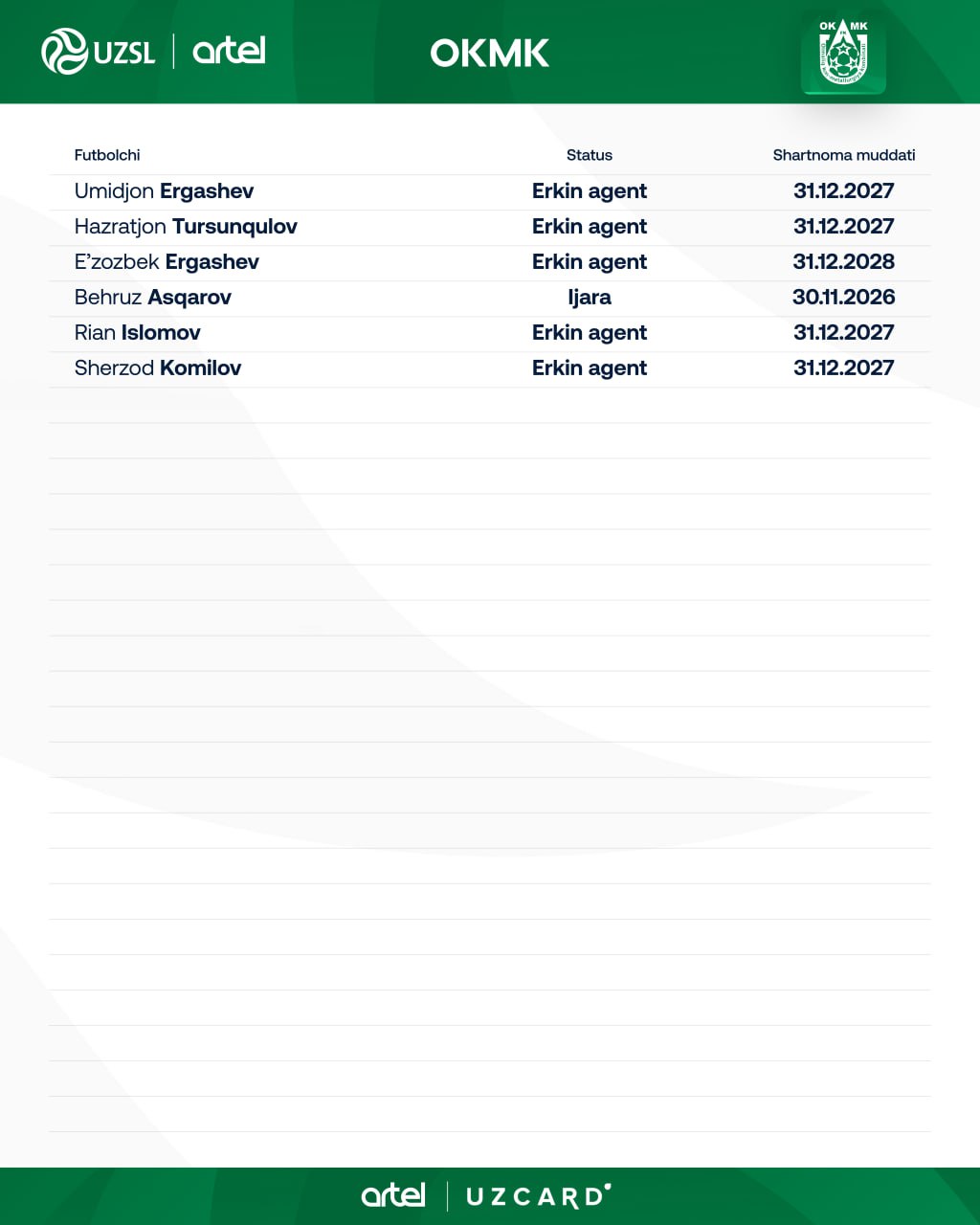 ОКМК жамоаси қуйидаги футболчиларни ЎзПФЛ рўйхатидан ўтказди.