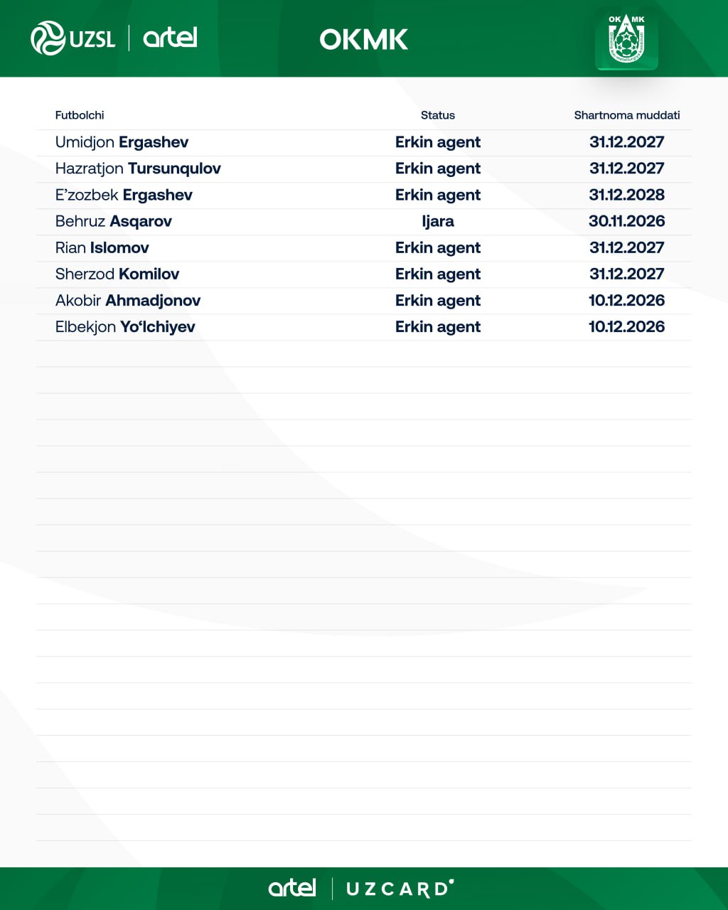 Тошкентнинг ОКМК клуби янги мавсумга жиддий тайёргарлик кўрмоқда. “Кончилар” бугун 8 нафар футболчини Лигада рўйхатдан ўтказди. Улардан 7 нафари эркин агент сифатида жамоага келиб қўшилган бўлса, бир футболчи ижарага олинди.