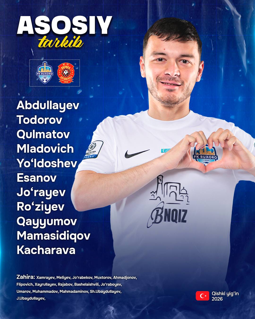 Бироздан сўнг "Бухоро" жамоаси Анталиядаги йиғин доирасида Косованинг "Дренича" жамоасига қарши учрашуви старт олади. Ўйин олдидан асосий таркиблар билан танишинг.