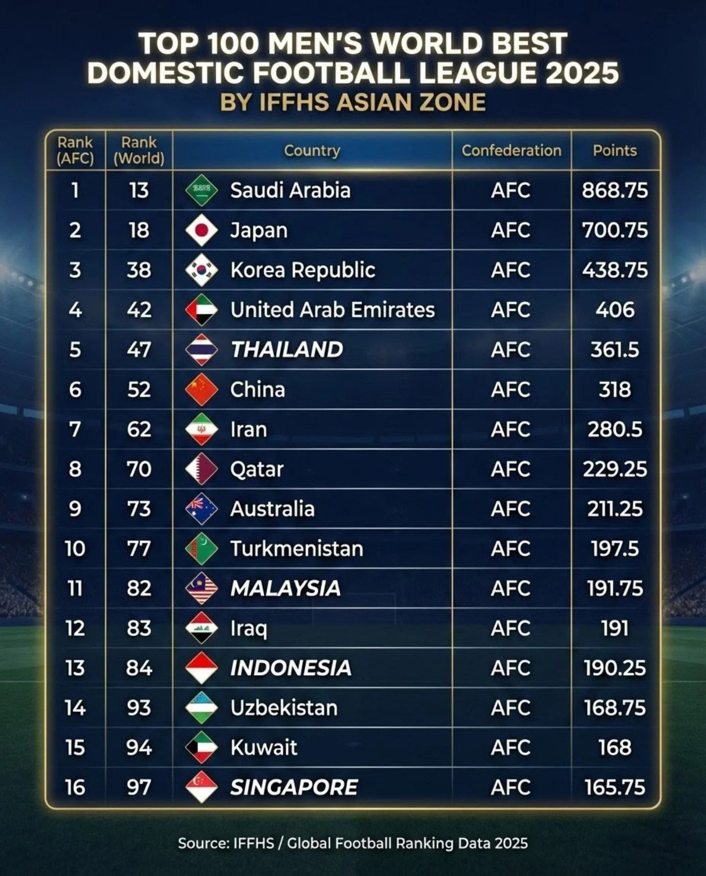 Халқаро футбол тарихи ва статистикаси федерацияси (IFFHS) томонидан Осиё қитъасидаги энг кучли футбол лигалари рейтинги эълон қилинди.