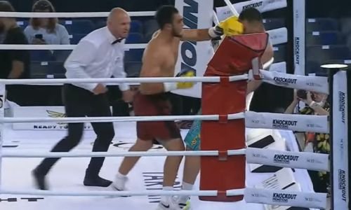 Биринчи раунд охирларида ўзбек боксчиси рақибини канатга қисиб қўйиб, унга зарбалар сериясини йўллади. Ўша паллада қозоқ ўзини буткул йўқотиб қўйди: қўлини пастга туширди ва жағига ён томонлама кучли зарбани ўтказиб юборди.