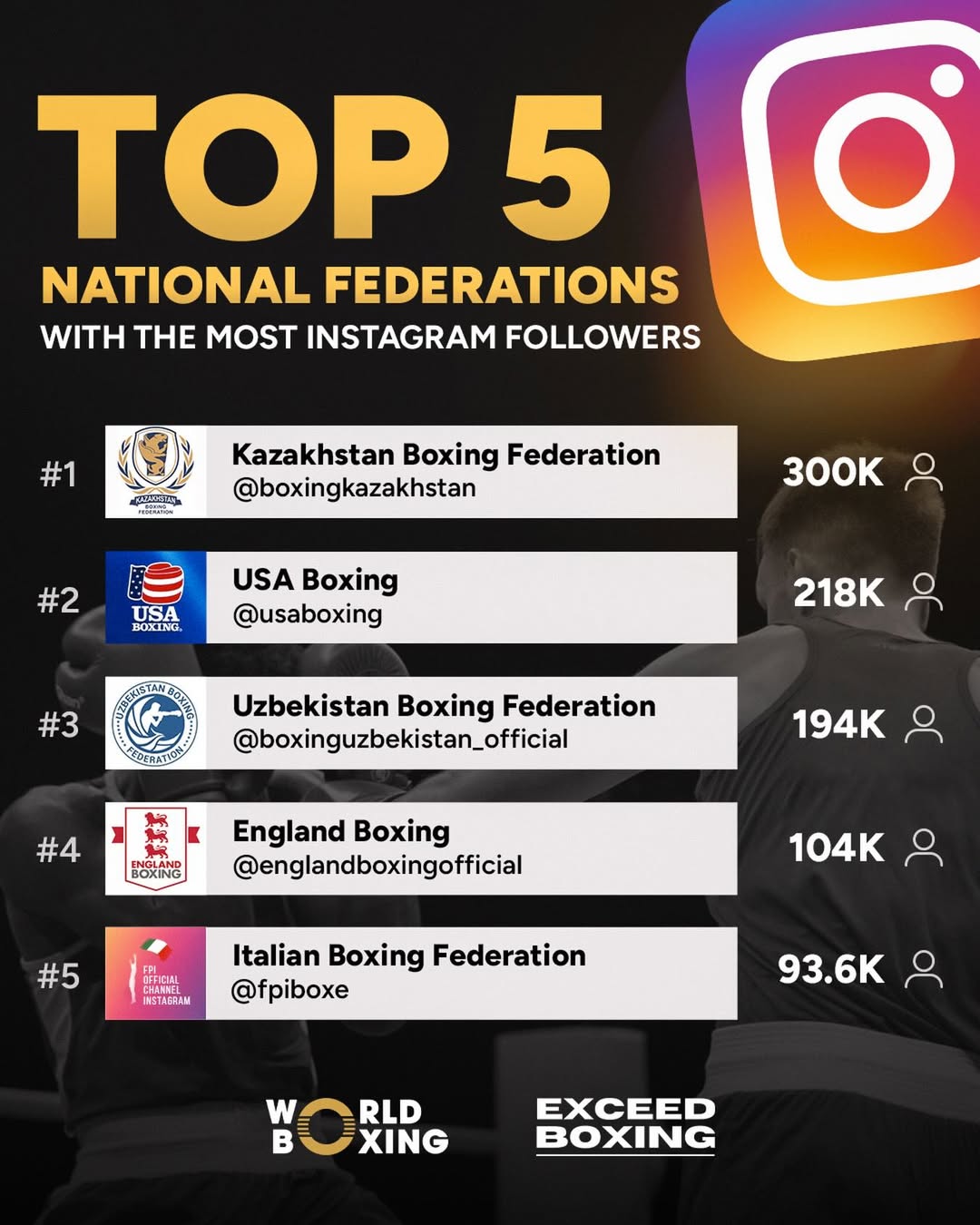 World Boxing ташкилоти Instagram ижтимоий тармоғида энг кўп обуначига эга миллий федерациялар ТОП-5 талигини эълон қилди.