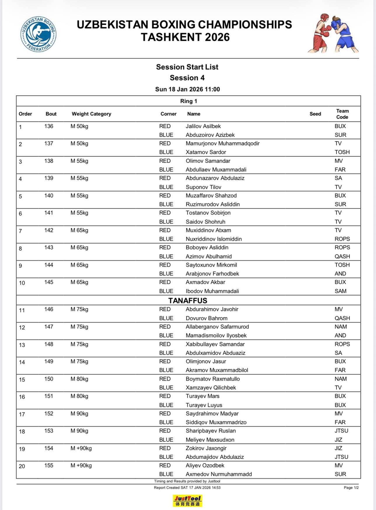 Айни кунларда Олимпия шаҳарчасида бокс бўйича катталар ўртасида Ўзбекистон чемпионати бўлиб ўтмоқда. Мусобақанинг навбатдаги кунида ҳам ажойиб жангларга гувоҳ бўламиз. Қуйида эрта рингга чиқадиган жуфтликлар билан танишиб чиқишингиз мумкин.