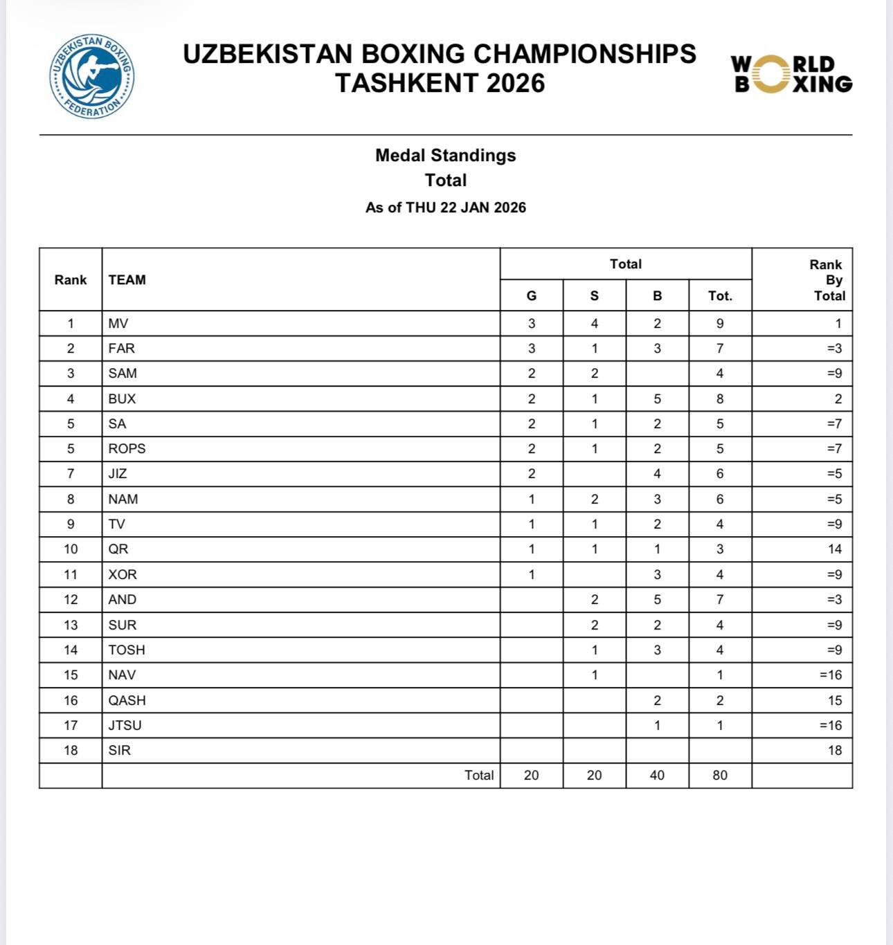Фарғоналиклар эса 3 та олтин, 1 та кумуш ва 3 та бронза медалига эга чиққан бўлса, Самарқанд жамоаси 2 та олтин ва 2 та кумуш билан кучли учликни якунлаб берди.