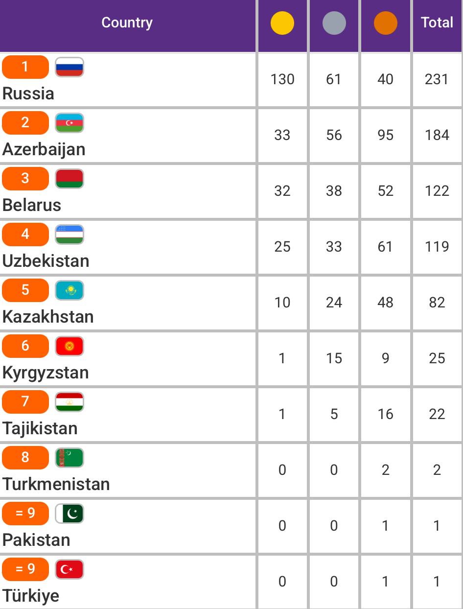 Шу тариқа Ўзбекистон делегацияси мусобақа давомида 25 та олтин, 33 та кумуш ва 61 та бронза, жами 119 та медал билан умумжамоа ҳисобида Россия, Озарбайжон ва Беларусдан кейин тўртинчи ўринни эгаллади.